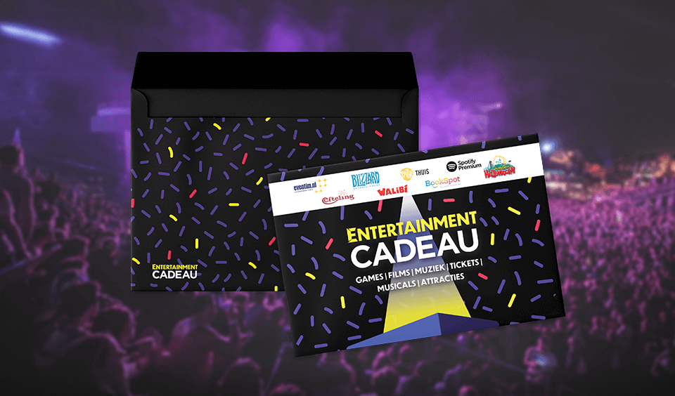 Koop nu De cadeaukaart biedt een ruime keuze aan diverse entertainmentmerken zoals; Spotify, Pathe Thuis, De Efteling en Bookspot. Zo is er een ruime keuze voor iedereen! EntertainmentCadeau is verkrijgbaar als plastic cadeaukaart in elke waarde tussen €5 en €150 en kan in delen worden besteed. Wie maak je blij met een uitje op uw kosten? EntertainmentCadeau is om te ruilen voor één of meer cadeaukaart(en) naar keuze.